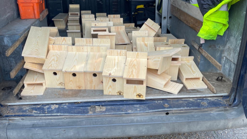 The boxes are going to be placed at various sites throughout the Broadland District Council estate. The areas have been selected are part of the Councils Biodiversity plan.  The bird and bat boxes will be put in numerous trees depending on the size of site, each box will achieve extra points towards the biodiversity score of the site.  The differing styles of bird box will also encourage different species to nest, dependant on what they prefer for example Robins and Flycatchers will prefer the open fronted design and Blue and Great Tits will prefer the small hole design.