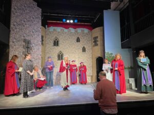 All were delivered to the Maddermarket on ‘get-in day’, the Sunday before the show was due to start. Guy, Julian and our Chairman Paul engaged with ENOS’ Robin Richardson and several of their members to transform the Maddermarket into a mediaeval castle fit for a king.